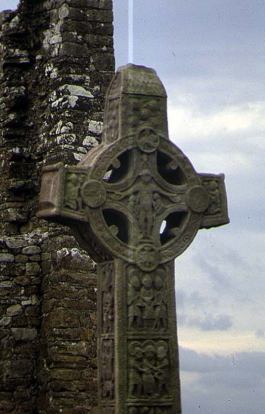 Eines der drei Hochkreuze in Clonmacnoise. Die Bilder, die in den harten Granit gehauen wurden, erzählen Stationen aus dem Leben Jesu. Sie waren nicht nur Zeichen der Andacht, sondern auch Anschauungsmaterial für das dem Lesen unkundige Volk.