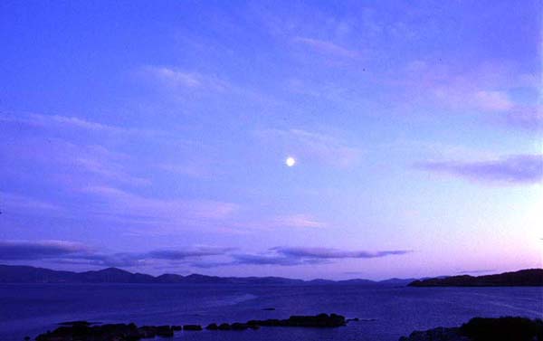 Sonnenunter- und Mondaufgang am Ring of Kerry. Trotz der Möglichkeiten der Bildbearbeitung sind die Farben auf diesem Bild echt.
