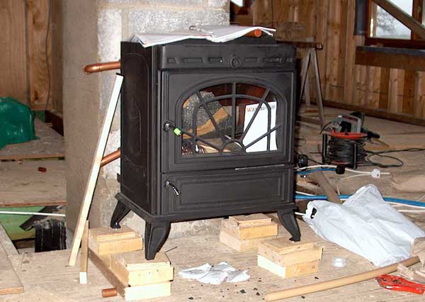begonnen. Hier ist schon mal unser Ofen mit eingebauten Boiler zu sehen, mit dem wir auch das Heiz- und Brauchwasser erwärmen können.