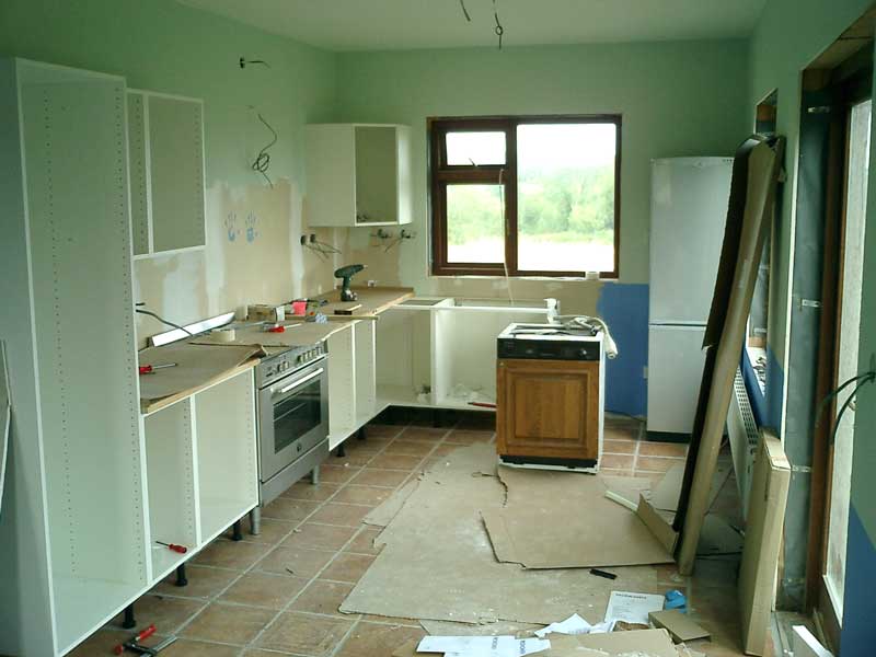 Das Wohnzimmer, farblich Ton in Ton, links unter dem Karton der Ofen mit Boiler fürs Warmwasser.
